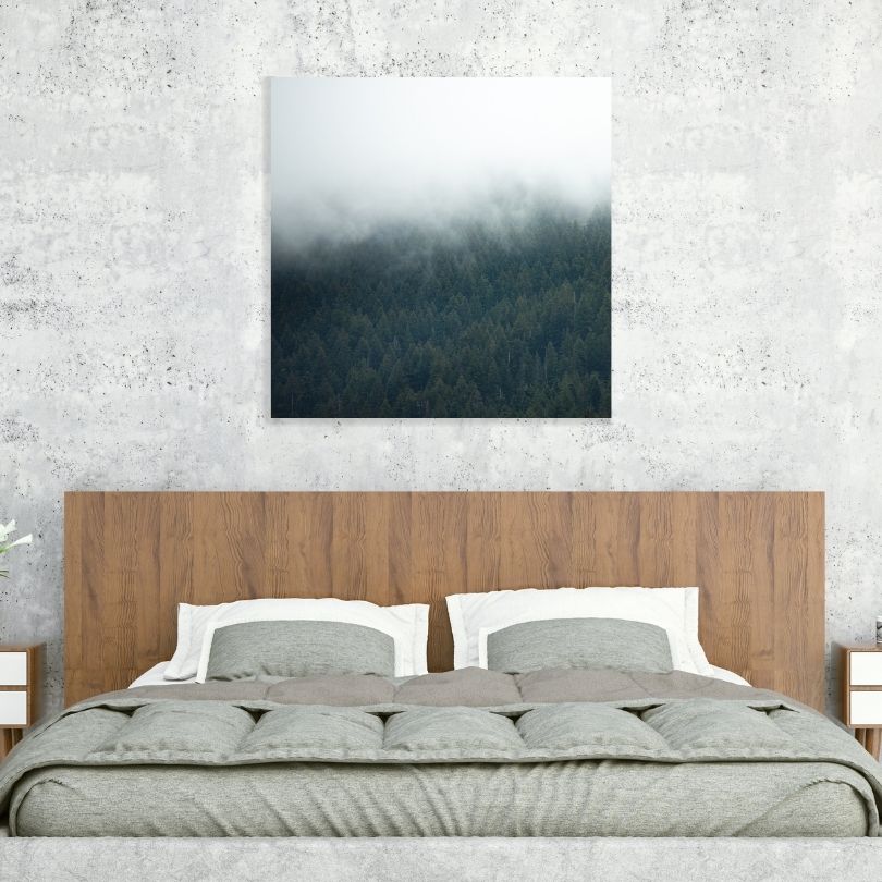 The mist, dense and elusive, swirls between the trees, playing hide-and-seek with the sunlight. It lends an enchanting touch to the surroundings, softening the edges and casting a serene, hazy glow. The colors of nature blend softly in this print—the vibrant greens of the trees and the muted grays of the fog create a mesmerizing palette.